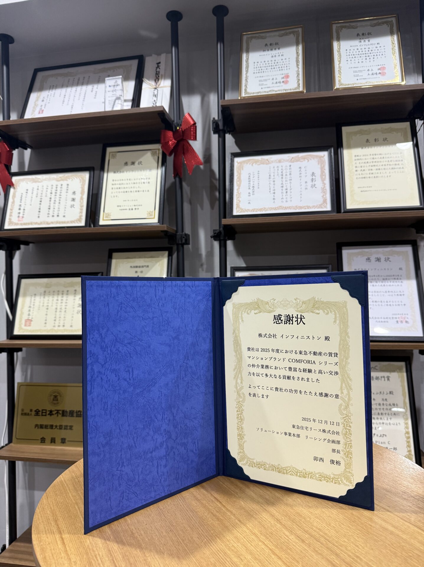 弊社は東急住宅リース様よりご招待を受け、「コンフォリア」シリーズの御礼会に参加いたしました。今回、弊社は「コンフォリアシリーズ 留学生賞」「外国人契約件数第一」を受賞させていただくことができました。この結果は、日々尽力してくれている社員一人ひとり、そしてご愛顧いただいている多くのユーザー様のおかげです。心より感謝申し上げます。これからも皆さまに選ばれ続ける存在を目指し、さらなるサービス向上に努めてまいります。本当にありがとうございました!